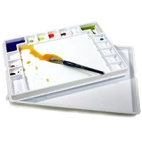 Lightweight Palette has a central large mixing area and 16 individual wells that allow you to easily pull color into the center for mixing. Features airtight cover that keeps colors moist when not in use, and doubles as a large mixing area for glazing and backgrounds. Includes Tom's own tips and techniques for using the palette. 16.5" x 12" x 1"