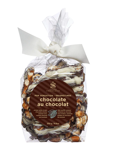 An addictive mixture of caramel popcorn, roasted almonds, and pretzel pieces all drizzled with dark and white chocolate