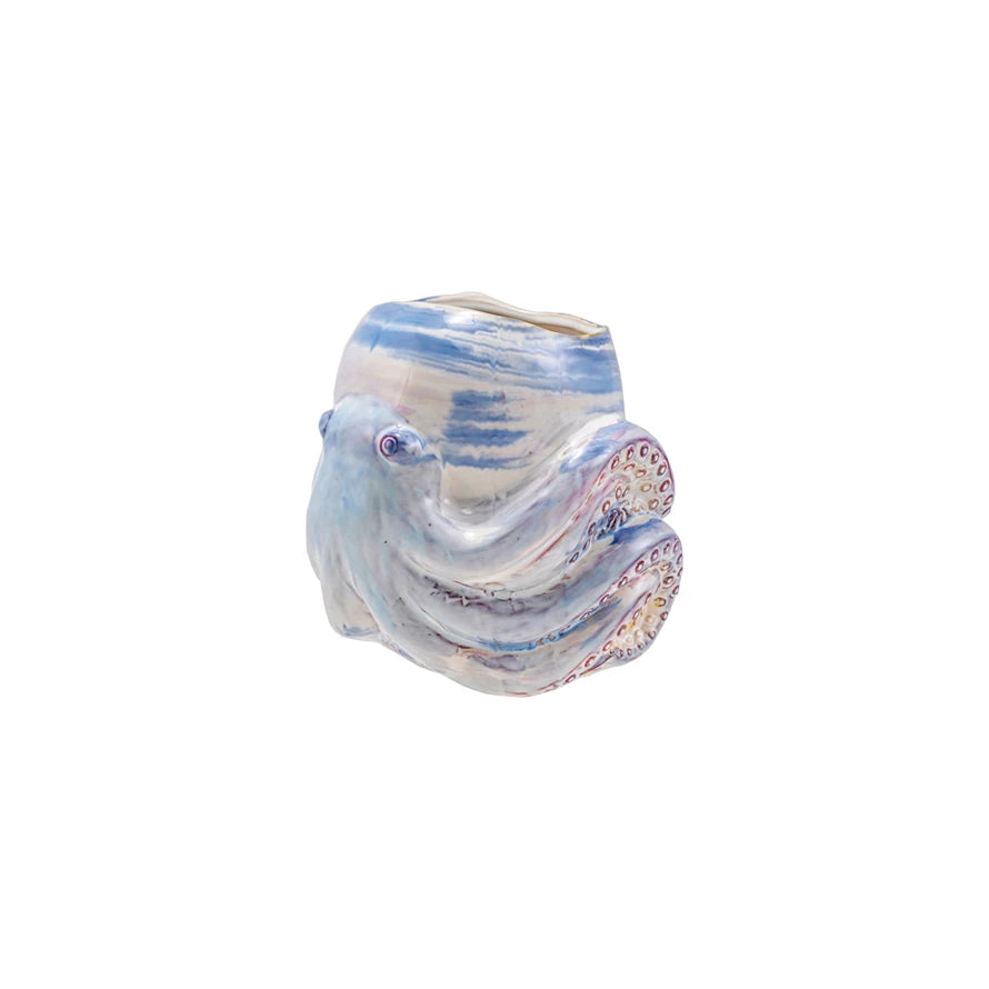 Stoneware Planter w/ Octopus, Reactive Glaze, White & Blue (Holds 4" Pot)