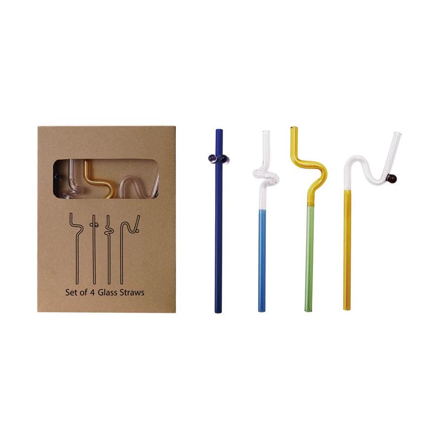 9"L Glass Twisted Drinking Straws w/ Balls, Multi Color, Boxed Set of 4