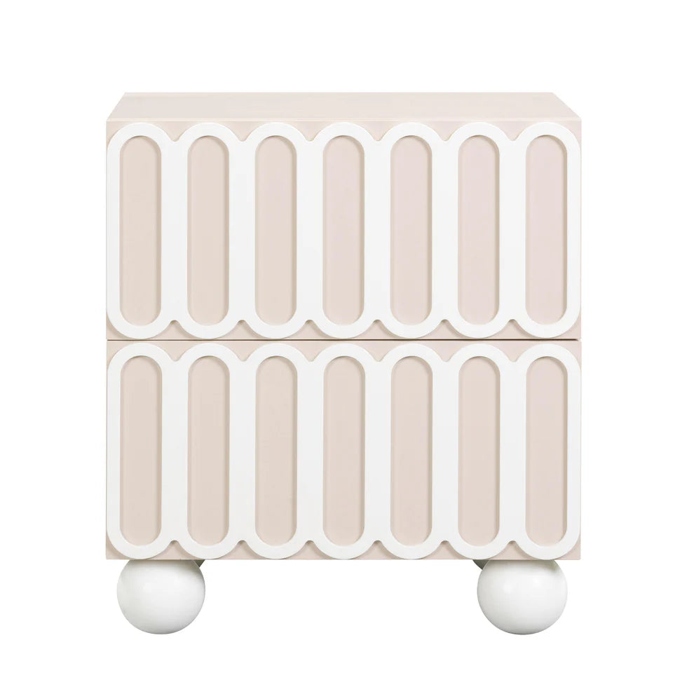 Say goodbye to a boring bedtime routine with the Tori Motif Nightstand, available in dreamy mauve or blue and sophisticated taupe, each featuring a statement-making facade that truly pops. Its solid wood, spherical legs infuse a sculptural Hollywood buzz, while the medium sheen on the surfaces delivers just the right amount of drama without fussy maintenance. Plus, the nightstand's drawers glide smoothly on soft-close rails, ensuring you keep the morning peace, not waking your partner as you start your day.